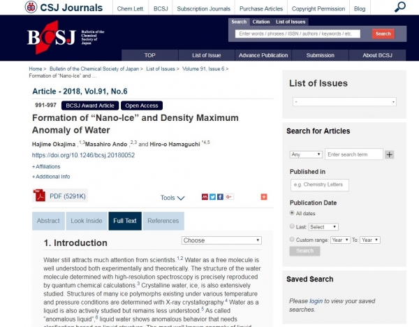 儘管多年以來已有大量且深入的研究,水仍保有其神秘的面紗。作為液體,水有許多異常現象尚未被完全理解,而其中最廣為人知的即為最大密度的現象。現在這個 最大密度的異常現象已由臺灣與日本的合作團隊(由國立交通大學濵口宏夫講座教授領軍),透過在低溫下形成奈米尺寸的微冰晶做出很好的解釋。這項研究成果將 在日本化學會Bulletin of the Chemical Society of Japan 六月號出版。